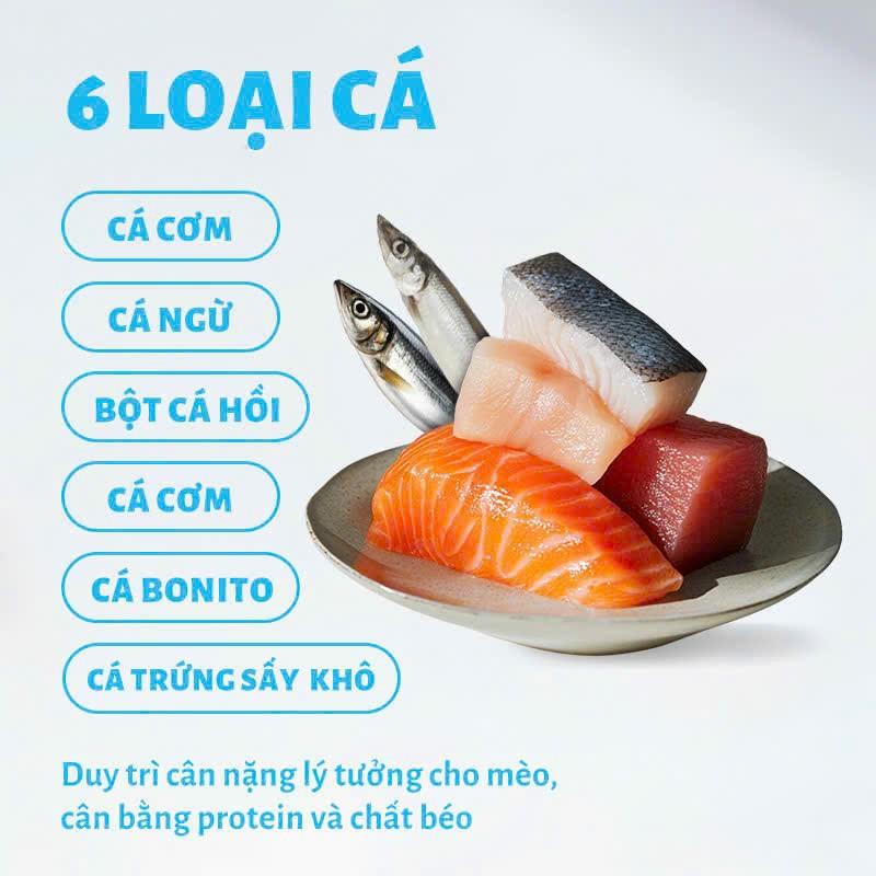 Nguồn thịt: 6 loại cá tươi: cá ngừ,cá hồi, cá tuyết, cá cơm, cá Bonito, cá trứng.